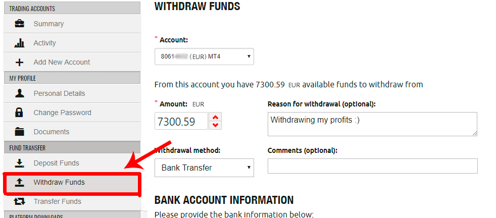 Como pode ver na imagem abaixo, decidir utilizar a função de "levantamento de fundos" para levantar 7.300,59€ da minha conta.